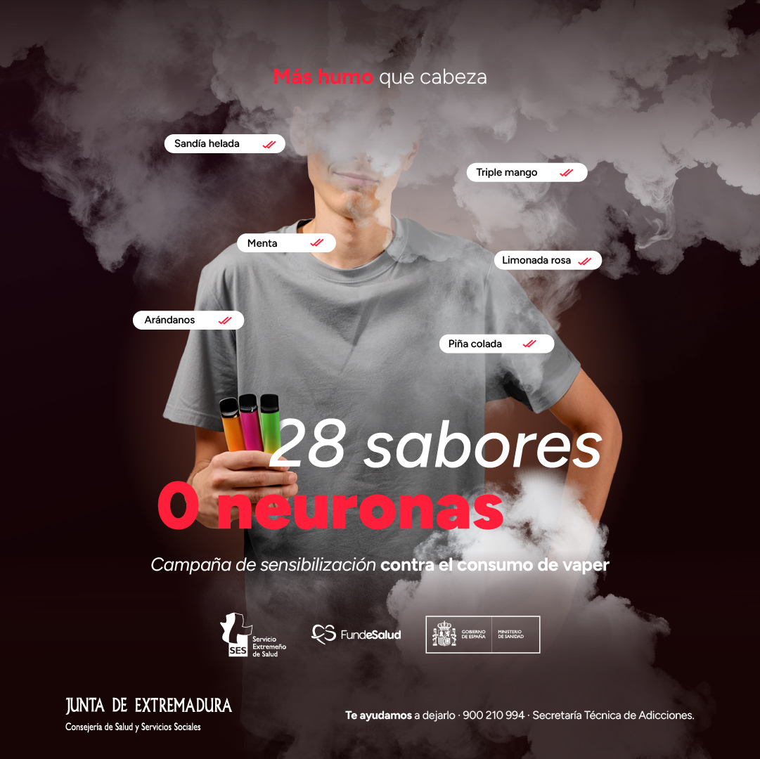 Es la campaña de sensibilización y prevención del vapeo en Extremadura dirigida a jóvenes y adolescentes “28 sabores, 0 neuronas”.
