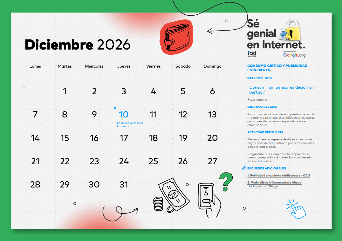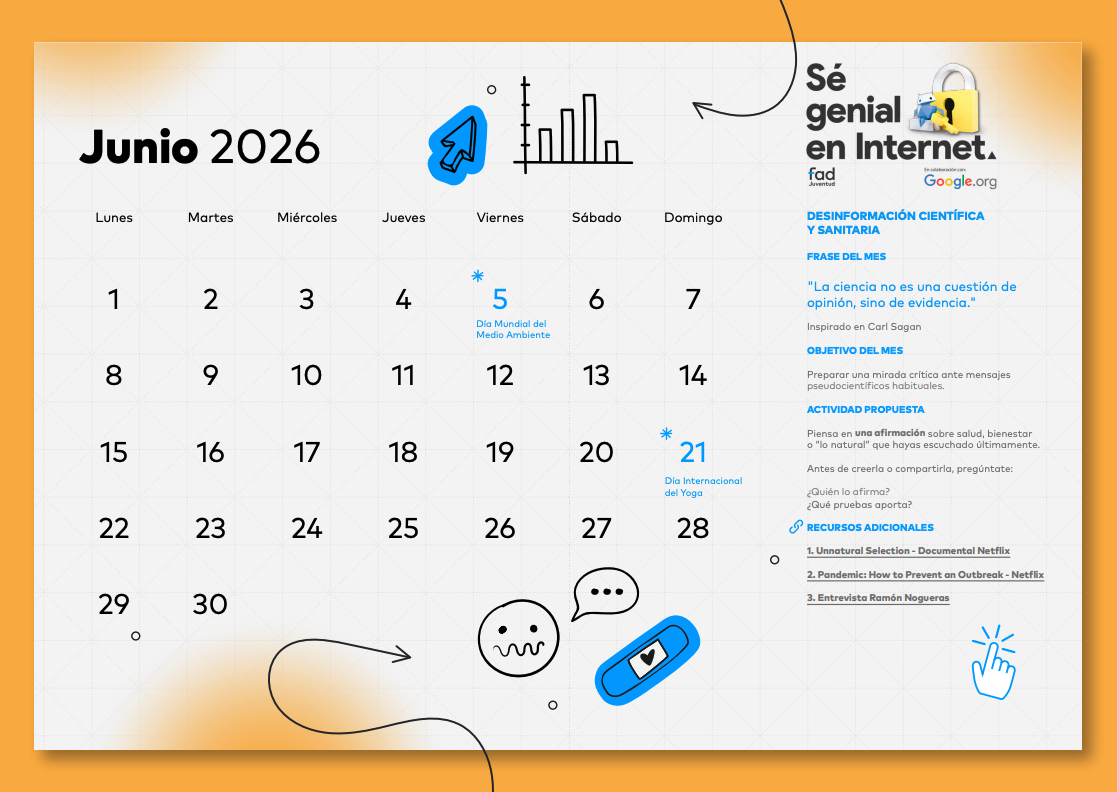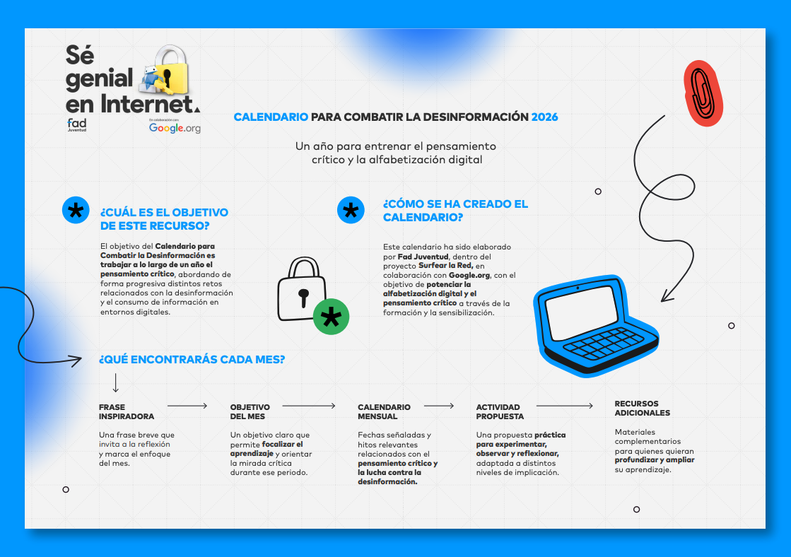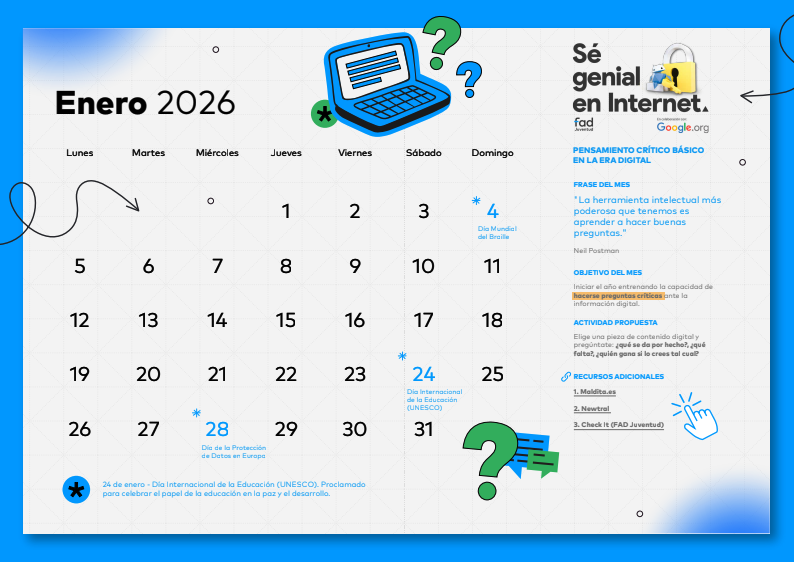 En él encontrarás un objetivo mensual a trabajar, frases inspiradoras relacionadas con el pensamiento crítico, un calendario con las festividades y días señalados para combatir la desinformación, una actividad que te proponemos desde Fad Juventud y recursos adicionales para las personas más motivadas que quieren profundizar en ello.