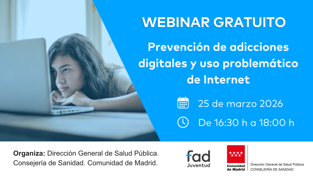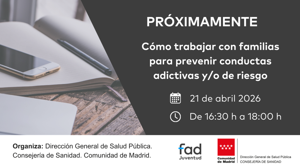 Durante el año 2026, dando continuidad a la actividad iniciada en 2025, la Dirección General de Salud Pública de la Consejería de Sanidad de la Comunidad de Madrid organiza un ciclo de webinars formativos, con la colaboración de Fad Juventud, sobre prevención de conductas adictivas, dirigido a profesionales de la intervención socioeducativa, salud comunitaria, educación formal y no formal, información juvenil, etc.