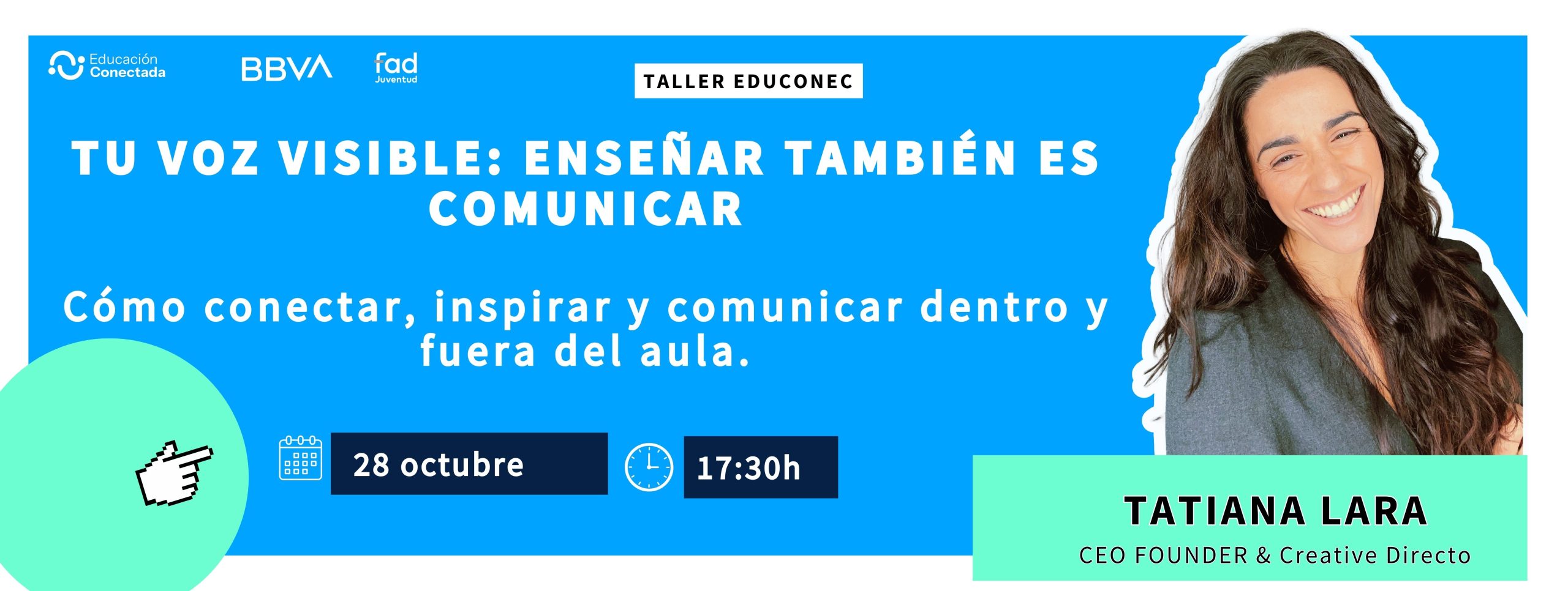 Tu voz visible, enseñar también es comunicar es un webinar enfocado en que la manera en que se explica, se acompaña, motivas o incluso cómo te presentas ante tu alumnado. Este taller está diseñado para ayudarte a reconocer y potenciar tu forma de comunicar desde la autenticidad, sin artificios ni estrategias de marketing, sino desde el propósito real de educar.